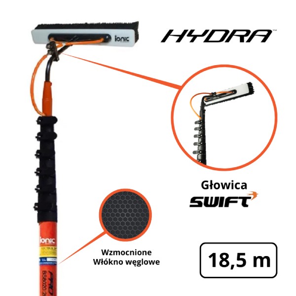 HYDRA w wersji PLUS (CFP) o jeszcze większej sztywności. to nowa lekka i mocna konstrukcja kija teleskopowego z przepływem wody i możliwością konfiguracji w zależności od potrzeb. Głowica Swift - wyjątkowo wytrzymała i zoptymalizowana do czyszczenia okien w zastosowaniach komercyjnych. (Dostępne szczotki: 12", 18", 24" Commercial)