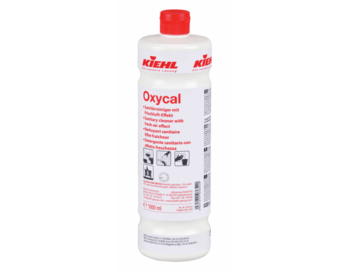 Innowacyjna mieszanina kwasów w połączeniu ze składnikami rozszczepiającymi tlen umożliwia szybkie czyszczenie o działaniu wybielającym w całym mokrym obszarze sanitarnym. Utleniające działanie tlenu neutralizuje nieprzyjemne zapachy i poprawia jakość powietrza w sanitariatach na zasadzie efektu świeżości. Uwalniany przez produkt Oxycal tlen wybiela przy regularnym użyciu ciemne plamy i przebarwienia. Produkt doskonale nadaje się do obszarów o wysokiej frekwencji np. lotniska, dworce itp.