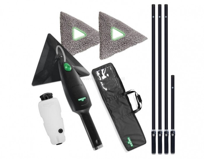 Narzędzie do inteligentnego czyszczenia dużych powierzchni szklanych. CZYSZCZENIE Wydajność i bezpieczeństwo mają ogromne znaczenie dla profesjonalnego czyszczenia okien i innych gładkich powierzchni wewnątrz. Czyszczenie okien za pomocą konwencjonalnych narzędzi jest bardzo czasochłonne. Wysokie okna są szczególnie trudne do czyszczenia, zwykle tylko przy ryzykownym użyciu drabin.