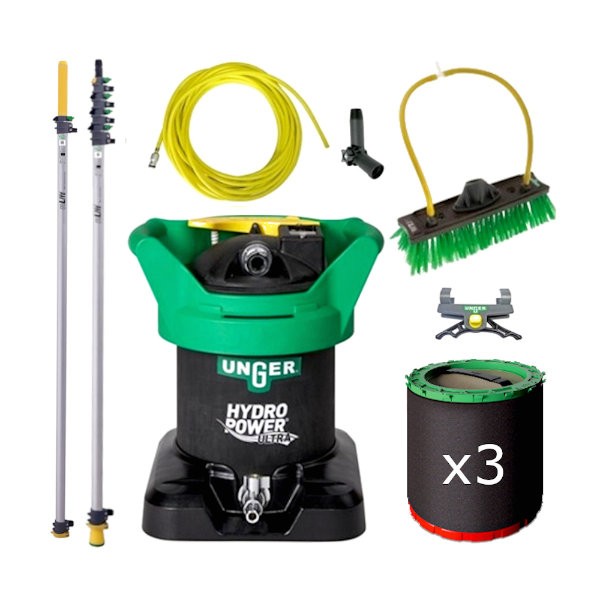 Korzystanie z profesjonalnych systemów UNGER nLite® z kijami teleskopowymi zasilanymi wodą sprawia, że czysta woda jest najbezpieczniejszą metodą czyszczenia na wysokości - bez potrzeby stosowania platform lub drabin.
