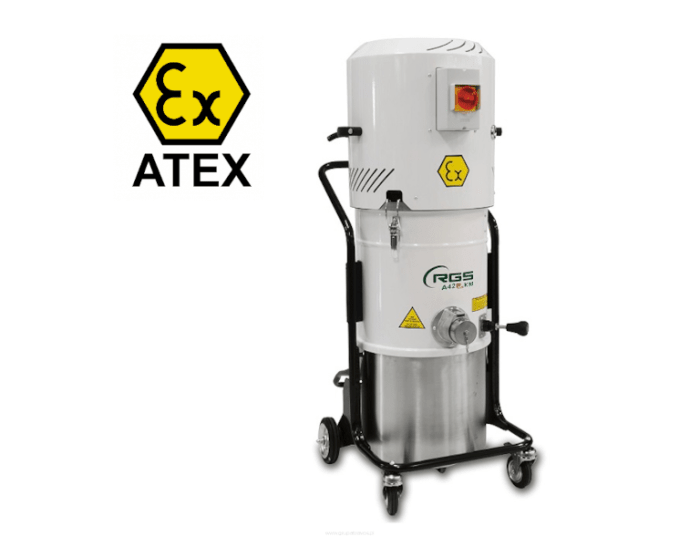 Odkurzacze przemysłowe w wersji ATEX mogą być stosowane w strefach zagrożonych wybuchem ze względu na obecność pyłu lub gazu wybuchowego. RGS oferuje urządzenia dedykowane do stref pyłowych z przyrostkiem "D" lub do stref zarówno gazowych i pyłowych z przyrostkiem "GD". Wszystkie odkurzacze są w kategorii "3", dzięki czemu mogą być stosowane w strefach 2-22, a niektóre modele są zbudowane przy użyciu komponentów kategorii "2" i mogą być stosowane w strefach 1-21. Do zastosowań w strefie 0-20 zaleca się użycie urządzeń pneumatycznych. Wszystkie maszyny są zbudowane przy użyciu komponentów elektrycznych zgodnie z dyrektywami ATEX. Wszystkie serie standardowych odkurzaczy dostępne są w wersjach ATEX.